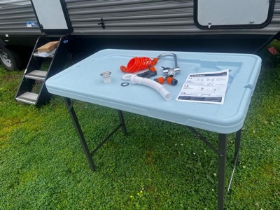 [This review was collected as part of a promotion.] Super easy set up! It is a great height for cutting up meat or putting up corn. It will be so handy to have an outside table with water connections when we take our camper out and when cutting up game!