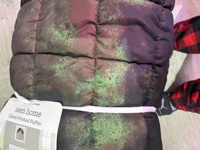 Teen home camo printed puffer comforter is perfect for kids and teens. Its soft and warm with a pleasing print. Machine washable is a huge plus. 100% polyester outer fabric and filling. Good value for kids or guest bed use.