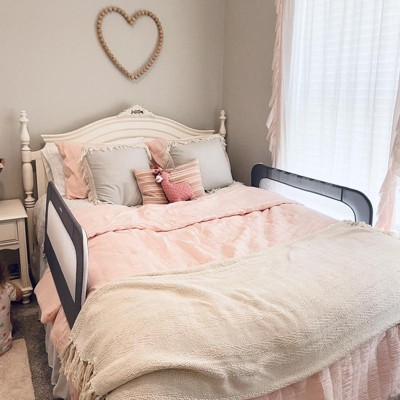 Love this bedding! It’s the perfect blush pink, so the undertone isn’t purple like a “tickle-me-pink,” and it’s not a bubble-gum pink either. I went back and forth online because the color of the stock photo looked perfect for what I wanted but I was scared it’d be different in real life. I finally just went to the store to see. The pictures online are true-to-color. I love blush pink, it’s the perfect color for my little girl’s “big-girl room.” The comforter set, itself, can be dressed up or down and is a really good price, especially considering who wants to break the bank on bedding that will likely live to see the occasional accident? I have not washed this yet, but feel like most bedding doesn’t do so well in the wash but rather dry cleaned, which at that point, you may just want to buy a new one at this price or try the at-home drier cloth way.
