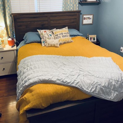 - Seersucker duvet cover with a ruched finish adds subtle texture to their bedding ensemble
