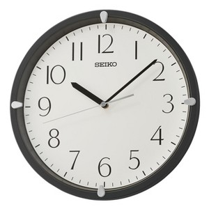This 12 Inch Seiko Wall Clock features a unique bezel on the quarter hour to add a little style to any room. The quiet sweep second hand moves continuously, eliminating annoying ticking sounds and allowing worryfree use in all quiet spaces. Large numbers are easy to see and read. Glass cover over a the frame complete the look. Powered by 1 AA battery (included). Overall dimensions: 11.8 X 11.8 X 1.7 inches. All Seiko clocks are equipped with quartz movement making it the most accurate at time keeping.