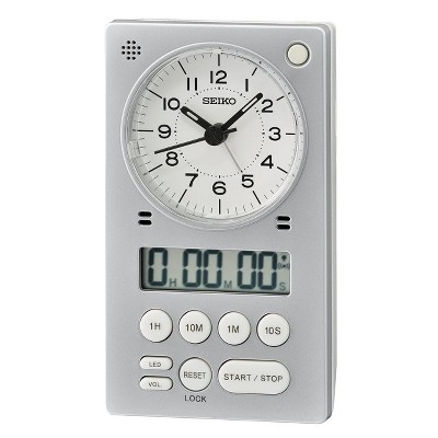 This Seiko Alarm Clock is an alarm clock like no other. Not only is this a clock with an alarm, it is also a countdown timer and a stopwatch. The analog clock features a quiet sweep second hand, no ticking sound here! The beep alarm also features a snooze and light. A convenient folding stand is included for just the right placement. Powered by 2 AA battery (included). Overall dimensions: 2.6 X 4.7 X 1.5 inches. All Seiko clocks are equipped with quartz movement making it the most accurate at time keeping.