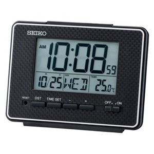 Wake up to style and the days most pertinent information with the sleek, handy alarm clock. The Seiko Digital Alarm Clock has a black case with a white accent around the frame. This digital clock has easytoread display that features a calendar, thermometer, and dial light. The snooze feature is handy, no matter if you are hopping out of bed or just need a few more moments of shuteye. The light feature is perfect in lower light settings. The time set functions are conveniently located on the front of the clock for ease of use. Powered by 2 AA battery (included). Overall dimensions: 3.7 X 4.8 X 1.9 inches. Perfect for tween to adult.