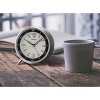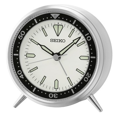 Seiko Heritage Design Clock is inspired by the Seiko Diver's Watch. This sporty clock features a durable aluminum silver colored case and two legs for just the right positioning. The number indicators along with the hand and hour indicators feature LumiBrite which make for easy reading in low light. The outer rim features numerals in 10 minute increments. A beep alarm completes the functionality of this fun, sporty, giftable clock. Powered by 1 AA battery (included). Overall dimensions 4.4 x 3.9 x 1.6 inches. Quartz crystal movement allows for the most accurate time keeping.