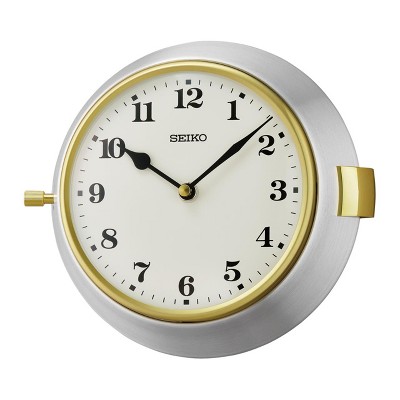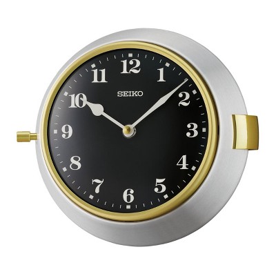 Ahoy mate! Inspired by a traditional porthole, the Seiko Wall Clock is a great addition to any space. The circular window analog clock is sure to please. It features an aluminum case with golden accents. Choose from silver and white or silver and black. Powered by 1 AA battery (included). Overall dimensions: 8.1 X 8.7 X 2.7 inches. All Seiko clocks are equipped with quartz movement making it the most accurate at time keeping.