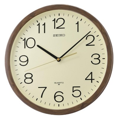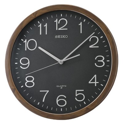 Seiko Wall Clock has a modern twist on a classic functional wall clock. you will notice the updated brown marblelike case complementing the striking black dial. Black updated numerals along with hour and minute complete the look. The golden colored quiet sweep second hand continuously glides around the clock, eliminating annoying ticking sounds. Perfect for any space requiring absolute quiet. Powered by 1 AA battery (included). Overall dimensions: 14.3 x 14.3 x 1.7 inches. Perfect for the kitchen, family room, board room or any office space.