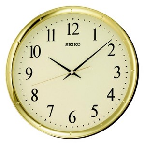 This Seiko Wall Clock is simple, ultramodern wall clock brings simplistic style to any space. Choose from a round shiny gold or silver plastic frame with easytoread black details. All this with a sweeping second hand which glides around the clock eliminating ticking sounds. Powered by 1 AA battery (included). Overall dimensions: 12.2 X 12.2 X 1.7 inches. All Seiko clocks are equipped with quartz movement making it the most accurate at time keeping.
