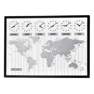 Always know the time around the world with the Seiko Wall Map with 6 Time Zone Clocks. This wall clock is modern, handsome and has a black wooden frame and depicts a flattened map of the world. It showcases six clocks for different time zones and includes metal plates with 32 major cities to choose from for your convenience. Dresses up any office! Batteries included.