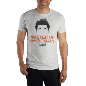 Look no further for the next great addition to your clothing collection because this Seinfeld t-shirt features a one-of-a-kind design. It displays custom artwork of Kramer's wild hair along with text that reads: 'Master of my Domain'. The direct-to-garment printing technology gives the design sharper detail and makes it long-lasting. The crew neck collar and short-sleeve design are perfect for any casual occasion. Your collection of Seinfeld fan merchandise isn't complete until it has this Kramer tee.
