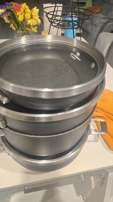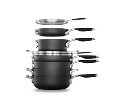 This space-saving line also securely stacks to save 30% more space than its non-stacking counterparts. Thanks to their unique design and flat glass covers, the pots and pans stack and nest in any order when stored on other items of the same diameter.