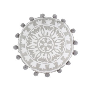- THE COLLECTION: The grey and white decorative pillow complements the Selesta Blush collection and features an intricately crewel stitched medallion in grey on a white ground with pom poms all around.