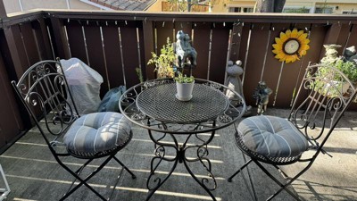 This set is so adorable and small enough for my condo porch! It’s sturdy, well built and I love the antique look! The wrought iron assembly is easy to put together. It’s nice to have a cup of tea in the morning on. I only dropped a star because it is difficult to serve food on the table with the way the grating is designed. I’m currently looking for either a wooden or marble top for when I want to have a meal on it.