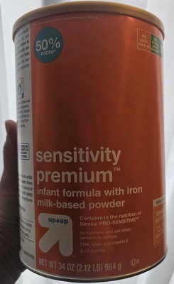 Compare to nutrition of Similac Pro-Sensitive. up&up™ Sensitivity Premium provides complete nutrition with 99 percent less lactose as compared to standard milk-based formulas. Prebiotics help support digestion and immunity by encouraging the growth of naturally occurring beneficial bacteria in the digestive tract; 2’-FL and LNnT HMOs are prebiotics like those found in breast milk to help support baby’s immune system. Human Milk Oligosaccharides not from human milk. NON-GMO reduced lactose formula helps to support baby's growth, brain and eye development. Ingredients not genetically engineered. No artificial growth hormones. No significant difference has been shown between milk derived from rbST-treated and non-rbST-treated cows. Certified Kosher by the Orthodox Union - OU-D. This product is not manufactured or distributed by owner of registered trademark Similac Pro-Sensitive. Sensitivity Premium does not contain identical proprietary ingredient blend of prebiotics, patented levels of nucleotides, lutein and lycopene in Similac Pro-Sensitive.