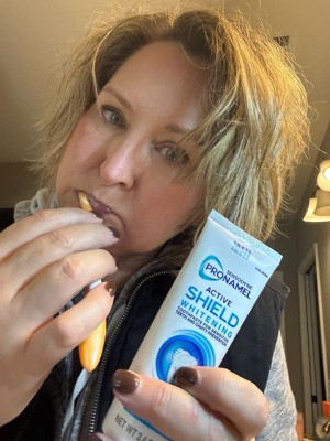 [This review was collected as part of a promotion.] Pronamel Active Sheild Whitening is where its at! I have da n aged my teeth from years of previous smoking and drinking coffee, and some whitening formulas can make my teeth hurt. This formula is gentle, effective, nice, and smooth..not gritty and too minty. The package us easy to open and close and won't squish in a gym orcyravel bag.