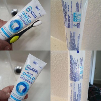 [This review was collected as part of a promotion.] Pronamel Active Shield Whitening toothpaste has a very easy to use tube that stands up. The toothpaste tastes good and leaves your mouth feeling clean and refreshed. Overall, I really like this toothpaste. In full disclosure though, I did receive this as a gift in exchange for my honest and open review. I think it's a great toothpaste.