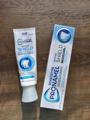 - Two 3.4 oz tubes of Cool Mint flavored Sensodyne Pronamel Active Shield Whitening Enamel Toothpaste