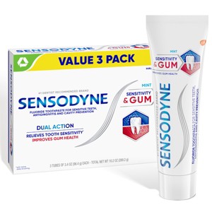 - Three 3.4-ounce tube of Sensodyne Sensitivity & Gum Sensitive Toothpaste