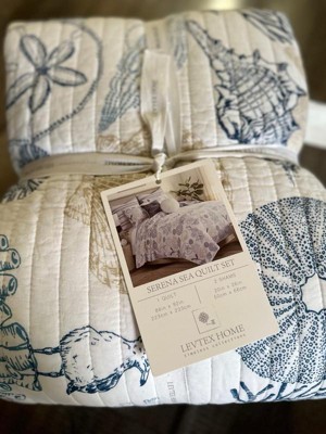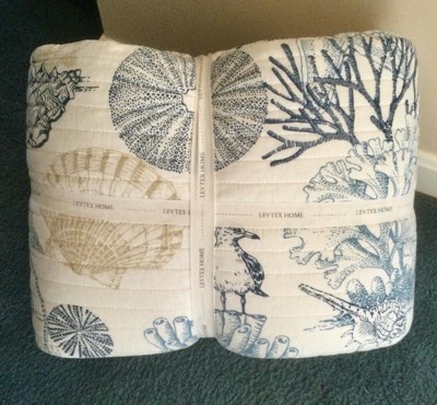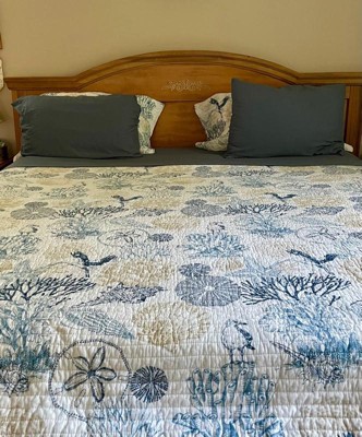 [This review was collected as part of a promotion.] Such a pretty seaside pattern! I love the new look it brought to my bedroom. The quilt & shams are high quality and feel like they will last a long time. The quilt is heavy and warm. It’s extra large on my king size bed which is much appreciated. It will help wi the middle of the night cover fights! My only complaints are that even after washing it has a little rough feel. Hopefully after a few washes it will soften. Also the shams tie close in the middle of the back. I’m not sure I like this or not. It looks pretty but since I sleep holding my pillows sometimes, the ties get in the way. Otherwise, it’s a beautiful, warm set that fits nicely in my bedroom!