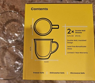 [This review was collected as part of a promotion.] Very nice 13.5oz glass mugs that are stylish and practical. They keep my hot cocoa hot and my iced coffee cold, better than other cups, due to the double-walled construction. It's not heavy. I like that it is microwavable and dishwasher safe. I'm going to buy now!