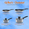 - Set includes small and medium fry pans and sauce pots with lids