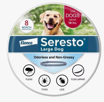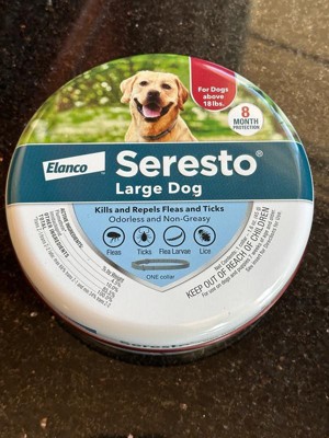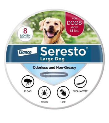Seresto large dog flea and tick collars are for dogs at least 7 weeks old and over 18 pounds, and no prescription is needed. They're odorless, non-greasy and water-resistant to swimming, exposure to rain or sunlight, bathing, and shampoo treatment.*