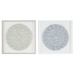 Add dimensional abstract art to your wall with this set of 2 framed shadow box wall decor pieces. Each square frame with a clear cover houses a piece of intricate circular string art, one metallic silver and one bluish-gray. The silver string art shadow box has a white backing in a matching metallic silver frame, and the bluish-gray string art also has a white backing and is in a white frame.