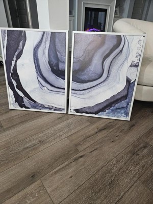 Crisp and serene, the Ethereal Printed Canvas by Artist Megan Swartz, provides a fresh and modern update to your decor. An abstract design, in light and dark shades of blue, spills across the canvas to create an icy cool contrast, while the white frame detailing adds a clean finish. A gel coat provides additional texture and a light glossy touch to this piece, while also preventing fading over time. Sold as a two piece set, each piece meausuring 23.5x29.5" and featuring 2 D-rings on the reverse, easily hang this set together for a larger focus piece or separately throughout your home for a cool touch to fit any space. With its contemporary style and frame detailing, this printed canvas wall art brings a stylish and gallery look to your living room or bedroom.