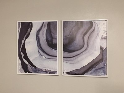 [This review was collected as part of a promotion.] In person, the colors look darker compared to the pictures in the product description. The prominent color is navy and the darkest color looks like a very dark grey. It is a beautiful set! The Madison Park Ethereal 2-piece Framed Canvas Wall Art Set is very eye-catching. Its abstract design adds style. It arrived undamaged and nicely packaged to protect it through delivery. Fantastic that it comes already with a solid white frame included. Although there are rings on the back to help hang it, mine were many inches off-center for both of the pictures. Overall, very satisfied with the two pictures and their high quality.