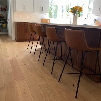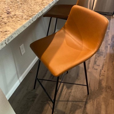 Pull this handsome counter stool up to the bar or kitchen island for a signature urban look. Designed with a gently scooped seat and low-profile back upholstered in beautiful, yet durable textured leatherette, its subtly exposed saddle stitching will leave your guests impressed. A welded steel base ensures this robust counter stool is a great choice for all kitchen countertops.