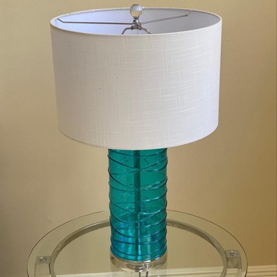 A pair of lamps to add sparkle to your space. Ribbons of glass create unique patterns on this lamp's glass cylinder base. The clean, simple lines and a drum shade have mid-century modern flair, while the sparkling clear glass adds a touch of glam. Beautifully crafted perfect for living room and bedside tables. On-off rotary switch on socket. Eco-friendly 9W LED bulb included. Takes one bulb and compatible with any 12W LED or 100W TYPE "A" or 23W CFL. UL Listed. Before cleaning any lamp shade or fixture, disconnect the power source. Wipe with a soft, dry cloth. Avoid the use of chemicals and household cleaners as they may damage the finish.