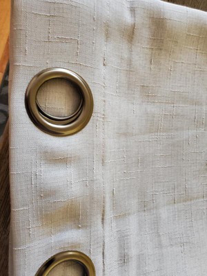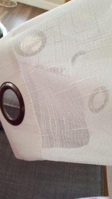 [This review was collected as part of a promotion.] Package came with two panels. The curtains are pretty translucent with what I take to be a wrinkle-free fabric. It has nice dark metal rings that helps to provide a nice fall. Half way to the bottom it has a delicate design. The fabric has some texture to it. It's hand wash. I'd buy again.