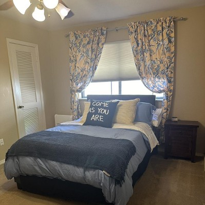Love the fabric - it may be cheap but is hangs nice. Light filtering which I usually go black out, but I Like the amount of light they let in. I don’t like the ruffle at the top so I hang them from the top hole. Allows some pooling on the floor. If you are looking for the perfect blue paint to match these curtains, it’s behr Norwegian blue. :)