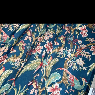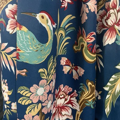 The print is bold and colorful. The blue background is not navy but more of a dark greenish blue. The flowers have shades of pink, peachy pink, gold, green. I really like them for the new bedroom I am decorating. They are fully lined as well but don’t have weights in the bottom but they still hang nicely.