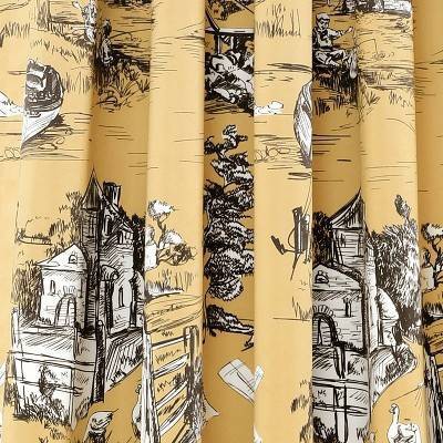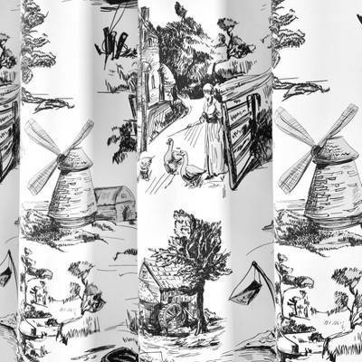 [This review was collected as part of a promotion.] These curtains are so unique! The design is of an old world style with a lady and ducks also a windmill and tree and a boat! I love the design and silky feel of the curtains. I'm thoroughly impressed with the quality look of this product. If I had any downfall to mention about these its that when the light shines through they do look a bit navy blue and not black. But thats not a big deal really. So overall they are a good value and look amazing! I plan to use them in our dining room when we move soon.