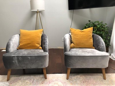 These chairs are lovely. The grey is a grey that is neither too cool nor warm. The material feel nice and easy to wipe up without leaving the hard crusty texture that velvets sometimes have. My kids like to snuggle up in them and read or watch tv. The size is proportional and suitable for a small living room. They are good for adults but I find they are also perfect for both my kids, big enough to cuddle up in. The legs are real wood and have a stain that is darker and less warm in real life than is shown in the picture. They came very safely packaged and took all of 5 minutes to assemble with just my hands. I am taking 1 star off for a few reasons, the legs Aren’t level and so they wobble. I just had wood floors put in a few weeks ago so I know my floor is leveled. They do include these black spacer type of things but they were still uneven after using them. They don’t have caps in the bottom of the legs, so I am afraid they will scratch my wood flooring. I do want to note that they do come with these white plastic caps that screw in and out of the leg, I am assuming it’s to finely adjust the height of the chair (like a stove). Lastly I am taking off that star because I have found that one of the legs, despite repeated tightening never quite stays, it always loosens up-not sure what that’s about. All in all they were a good buy, my kids are happy with them and the price that I paid for them after the sale and using my red card cannot be beat.
