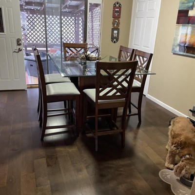 These chairs are the perfect height for a snack bar or kitchen counter. The wood is a medium brown stain and they look exactly as pictured! A star was taken off for the lack on instructions on how to assemble. The instructions were vague and we used the picture on the box to figure out which way pieces faced/how they went together. It was not the easiest to assemble. It took roughly an hour per chair because it required an allen wrench in areas where you could only get a quarter turn! There were some minor chips in the wood that we filled in with wood markers easily. One chair does have a massive crack in it on the back near where the seat/chair back meet, so we are seeking to return if new chairs come in before our return window!