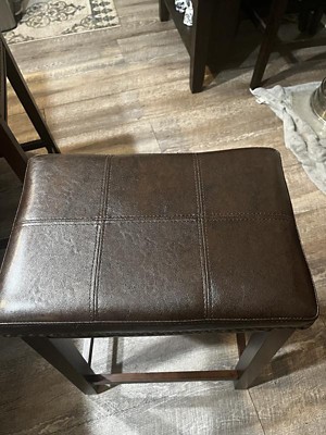 [This review was collected as part of a promotion.] We love these Linon - Espresso Brown Faux Leather Backless Counter Stools. They are so comfortable to sit on. The seat is soft and feels like leather and looks like leather. The stools were very easy to put together. The only thing they might need is a non skid pad to stop it from sliding on a wood floor. These stool look very impressive. And we are more than happy with them.