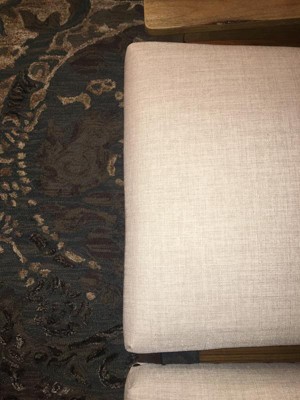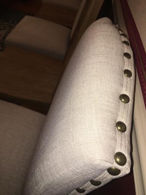 Exactly what I was looking for. Very easy assembly , took 10 minutes, color is definitely oatmeal/linen. Nail heads are brassy bronze not silver. Wooden legs are like an oak in color. Very comfortable. Highly recommend!
