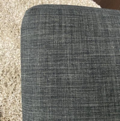 Chairs came well packaged, easy to assemble with clear directions to follow. I really like the look of these chairs, the upholstery looks even better in person, the pad is stuffed very well and firm. Has a small cross hatch design in the fabric. I would call the color a slate with tones of navy. I placed a heather grey tshirt against the fabric to show a comparison in color. The brass buttons give a nice tailored look but not overwhelming. Very pleased overall and would recommend.