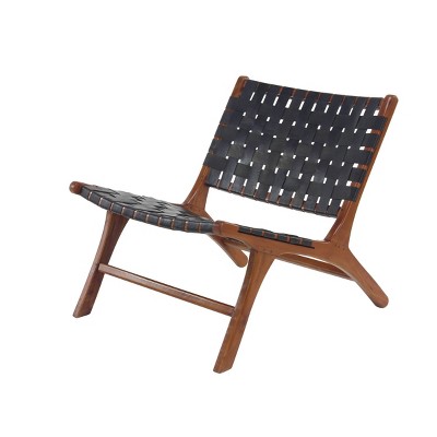 Kick back and relax as you wine down from a long hard day at work. Great for adding additional seating and storage with a charming appeal. Display this folding style leather chair next to your bookcase and black modern floor lamp for the perfect reading moment. This item ships in 1 carton. Mahogany wood accent chair featuring a leather seat with 1" thickness and 15.87" depth. Wipe clean with a dry cloth. Low profile wood chair with black leather strip upholstery. Suitable for indoor use only. Leather and hair on hide are natural products, and therefore no two will be alike. There may slight variations in pattern, natural blemishes, colors, and overall aesthetic of the product. Maximum weight limit is 250 lbs. Made in Indonesia. Contemporary theme.