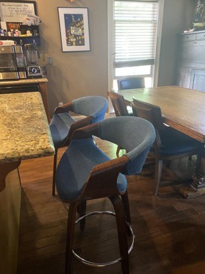 With a curvaceous dose of Mid-Century style, this unique design will look great at your counter area. Featuring a walnut finished stationary wood frame, luxurious woven fabric upholstery, swiveling seat, and stylish armrests. Available in multiple fabric finishes, you're sure to find one to fit your decor style! This style is also available for dining and office seating.