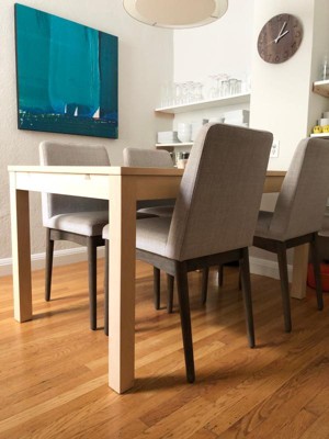 Chairs look great, and are stable (though be sure to look what legs you put on, they are marked for place, some for front, back left, back right, I did have to redo some because I did not pay attention. However, they are SUPER FIRM, and the seat is tall. I'm about 5'5" and my heels do not touch the ground, they also leave little leg room under the table, and I have a slightly taller then normal table. Between the firmness of the seat and not reaching ground I find them very uncomfortable and will be returning. I will say however, I have a small child, that is past the highchair phase and the added height is beneficial, as is the lack of available bouncing.