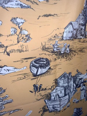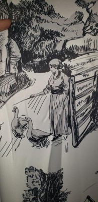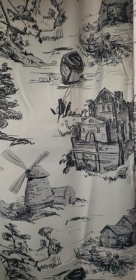 [This review was collected as part of a promotion.] These curtains are so unique! The design is of an old world style with a lady and ducks also a windmill and tree and a boat! I love the design and silky feel of the curtains. I'm thoroughly impressed with the quality look of this product. If I had any downfall to mention about these its that when the light shines through they do look a bit navy blue and not black. But thats not a big deal really. So overall they are a good value and look amazing! I plan to use them in our dining room when we move soon.