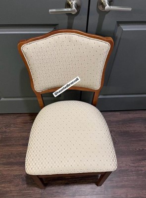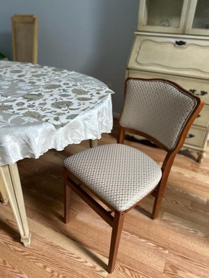 This French Inspired Style Folding Chair is constructed of solid hardwood with steel folding mechanism and padded, upholstered seat and back are the perfect addition to any home's extra seating needs. Set of 2. No assembly required.