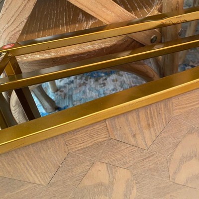 Use these handy and handsome nesting tables for everything from displaying decor to resting beverages on. These modern accent tables feature a sleek contemporary design to provide a stylish edge to your decor. The geometric parquet table top in a light wood tone adds European-inspired flair to any home. The simple square shape continues the clean lines and won't distract from the overall design. The golden bronze metal frame adds a warm and long-lasting look to this sturdy and versatile table set.