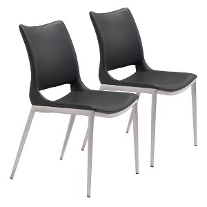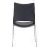 This sleek armless dining chair lets you sit back and relax in comfort. Its perfectly pitched back cradles you, while the sturdy steel frame supports your every move. The black faux leather seat is beautifully stitched adding a designer detail to a simple profile. Protective plastic feet will keep your floors from scratching. Gorgeous around your table, or pulled up to the desk in your home office.