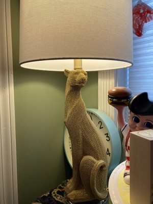 - A decorative table lamp featuring a drum shade, leopard-shaped body with bead accents, and round stable base