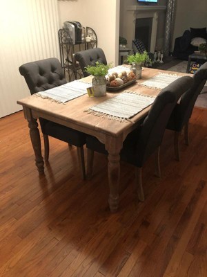 These chairs are a very nice addition to our table I also purchased at Target. Once assembled, they are very sturdy but lightweight. I will add that the color is a very nice gray with a linen type thread. The only part I didn’t like about these chairs was that they are hard to attach the front legs. It takes some patience and probably best to have two people. You must align the screws perfectly and it took much longer than it should.