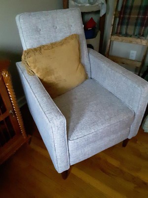 today is going to be an inconvenient trip to Target to return two gray recliners. the boxes are big and heavy and barely fit in my Ford Edge. I never put the chairs together so I can't comment on that. The fabric is gray tweed, looks sturdy, and is very pretty. The back has buttons but is not tufted. I'm afraid to order a different color due to the pain it presents if the color is wrong again.