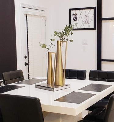 - •This stylish metal vase set features a tapered look from the opening down to the base together with a handle perfectly placed perpendicular to the opening forming a right angle for more style